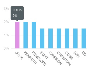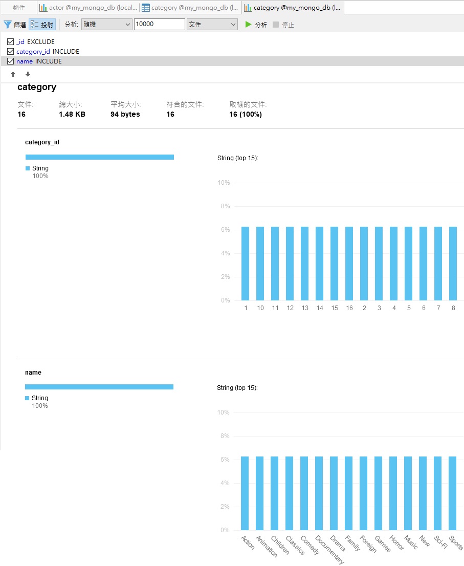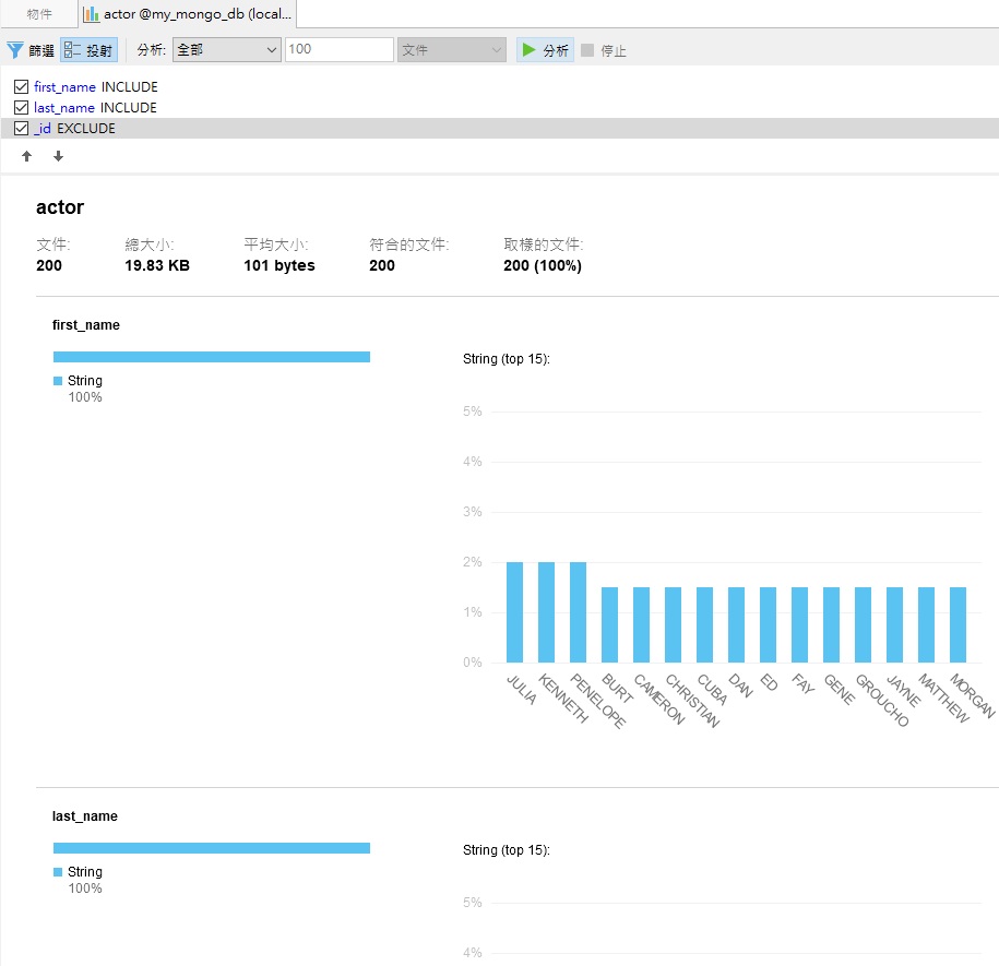 分析完成後,你將看到結構描述分析結果。結果顯示有關已選取欄位的類型和資料分佈的視覺化資訊。以下的分析結果顯示集合中前 15 名演員的姓氏和名: