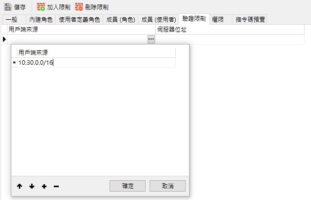 - 驗證限制 -若要編輯伺服器對角色強制執行的特定驗證限制,請按一下「加入限制」。