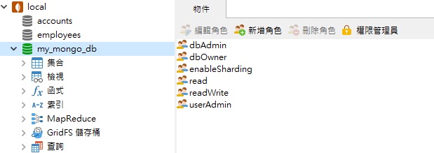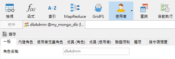 使用者的資訊和權限都儲存在伺服器上,因為 Navicat 在背後使用 MongoDB 的原生命令。使用者和角色命令位於主視窗工具列中。按一下該按鈕可開啟使用者或角色物件清單: