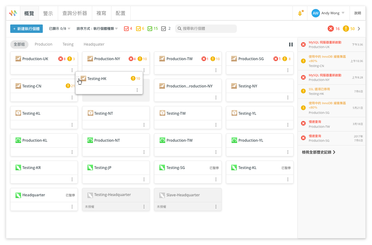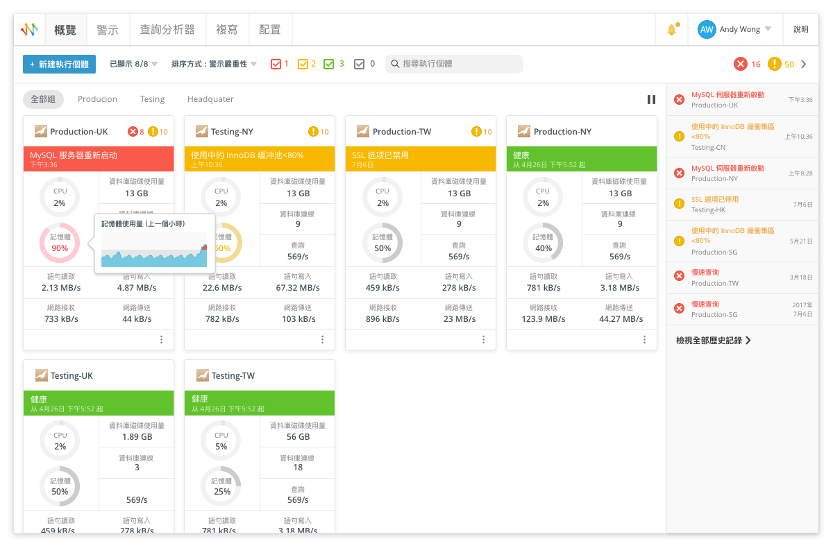 儀表板的目的是讓你一目了然地監控多個資料庫執行個體。它提供了一個易於理解的單頁摘要,其中包含與所有執行個體的健康狀況和效能相關的即時分析。此外,你可以在儀表板自訂想顯示的伺服器度量,以獲取每個執行個體的全面概況,並將執行個體分組使導覽執行個體更為流暢。