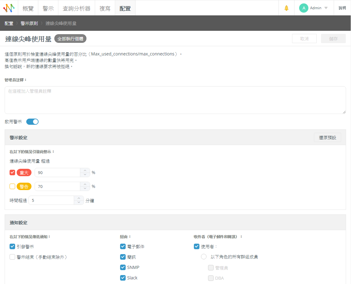 使用 Navicat Monitor,DBA 現在可以選擇透過 Slack,以及電子郵件、簡訊和 SNMP 接收警示。