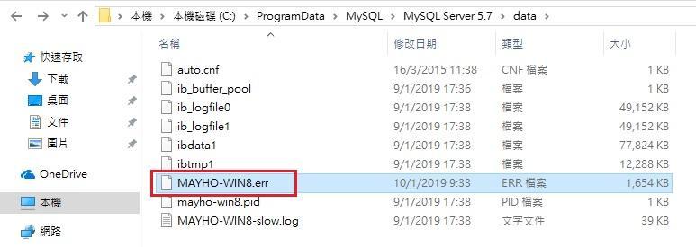 圖 1-Windows 中的 MySQL 錯誤記錄