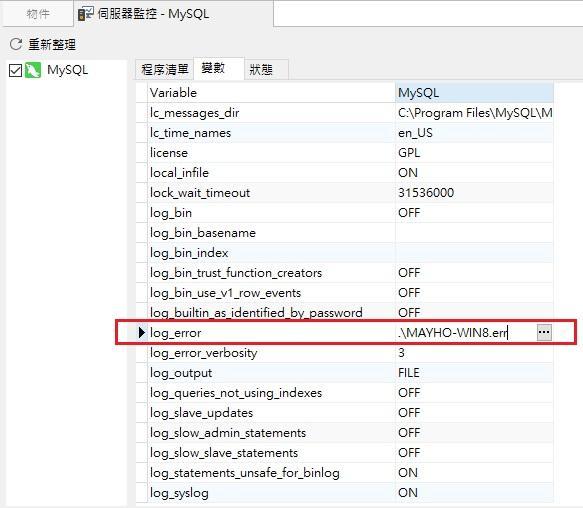 圖 2-在 Navicat 的伺服器監控工具中的 log_error 伺服器變數