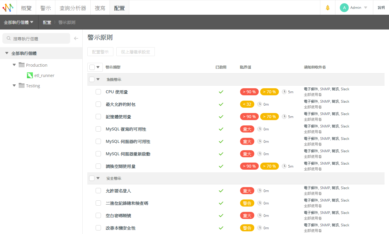 當受監控的度量值在特定時間內持續超過指定的臨界值時,會觸發警示。你可以啟用或停用警示並變更它們的臨界值和繼承設定。若要配置警示原則,請前往「配置」->「警示原則」。