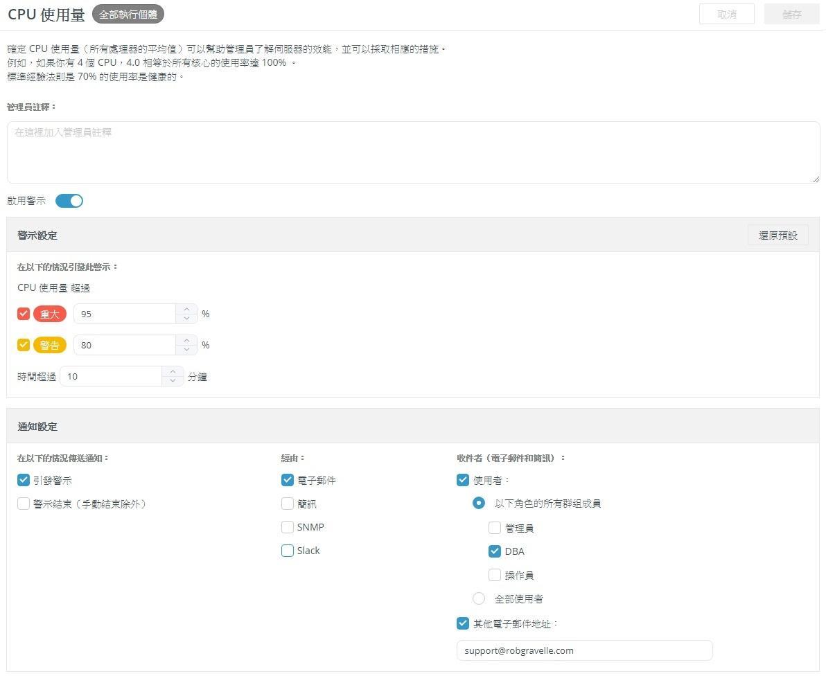 你可以看到 Navicat 已為每個警示提供預設值。例如,「CPU 使用量」警示定義了警告情況為 70% 的使用量,以及重大情況為 90%。此外,當警告或重大情況持續至少 5 分鐘時會觸發臨界值。在觸發後,會向群組內的所有使用者傳送電子郵件通知。