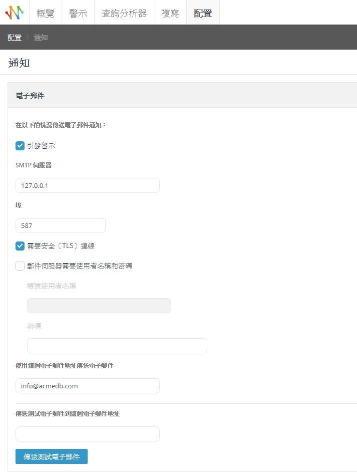 Navicat Monitor 提供三個選項,讓你在受監控的資料庫執行個體中引發警示時傳送通知,或在使用 Navicat Monitor 發生系統問題時傳送通知。這三個選項是:電子郵件、SNMP 陷阱和簡訊訊息。若要配置警示通知,請前往「配置」>「通知」。
