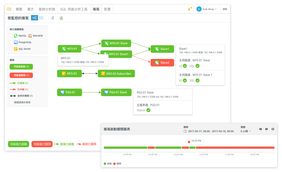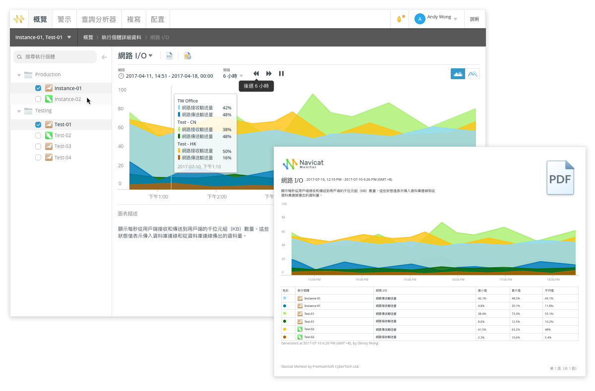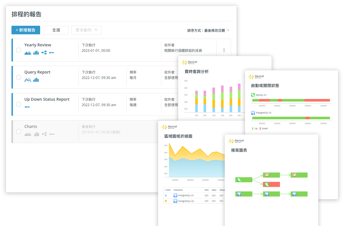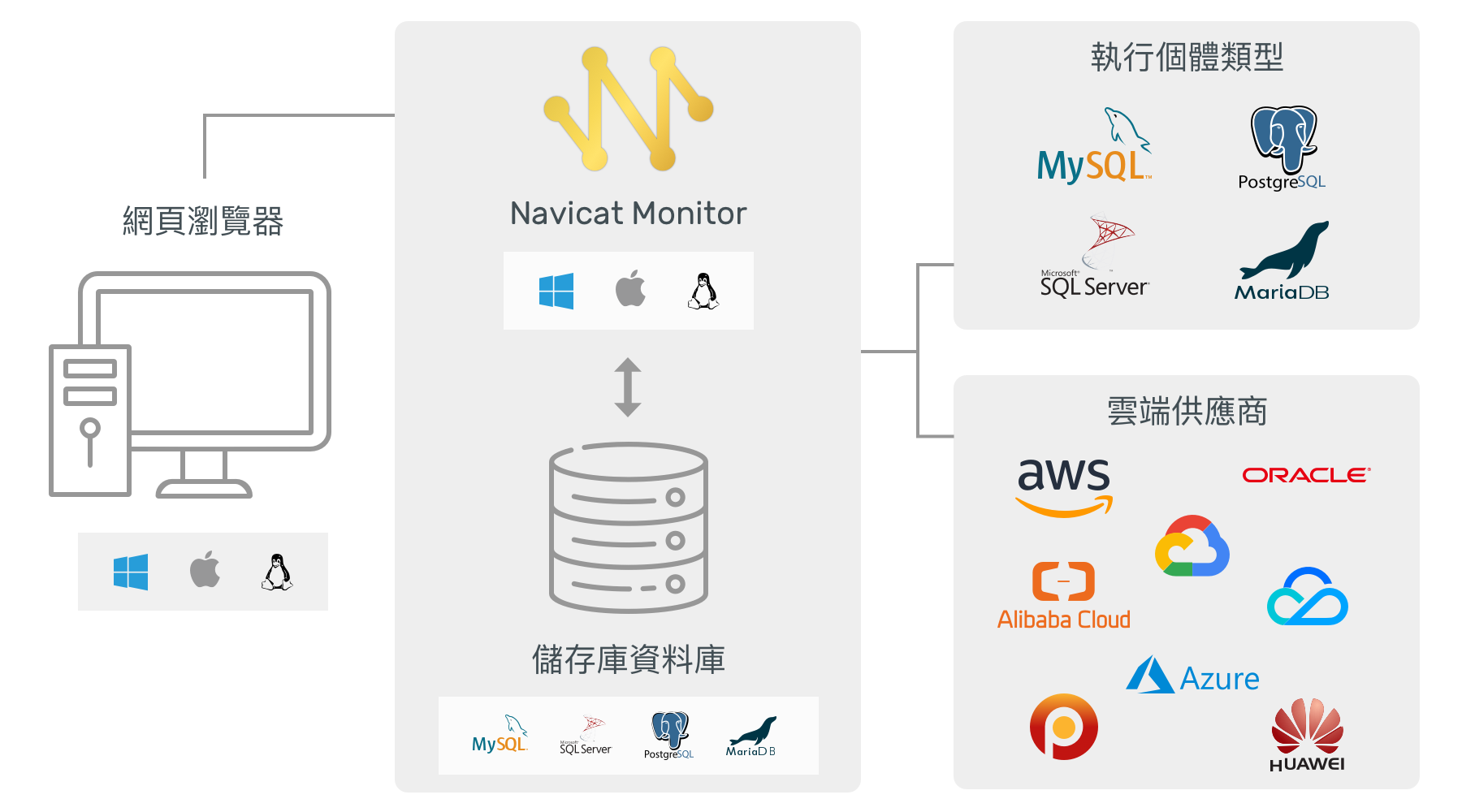 Navicat Monitor 是一款以伺服器為基礎的軟體,可以使用網頁瀏覽器從任何地方存取。透過網路存取,你可以全天候輕鬆無縫地掌握全球伺服器的狀況。