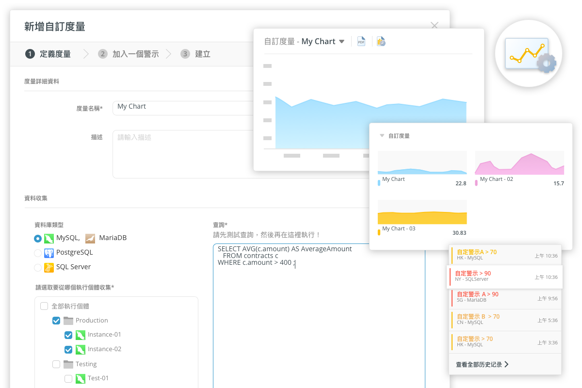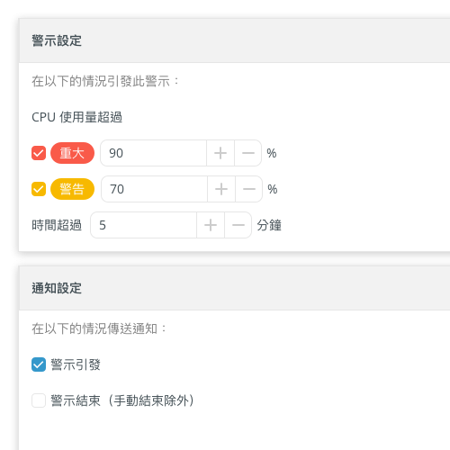 設定自訂警示臨界值來監控你的基礎設施。在達到定義的臨界值規則時你會收到警示。例如:當 CPU 使用率超過 90% 而時間持續超過 30 分鐘時引發警示。
