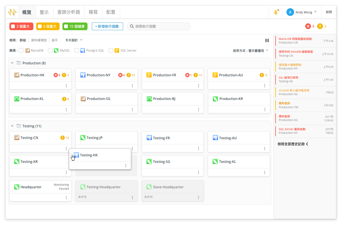 在基礎設施中無論何時發生警告或重大情況時,都可以透過電子郵件、簡訊、SNMP 或 Slack 獲取通知。一旦收到通知,你就能快速診斷並解決資料庫問題。