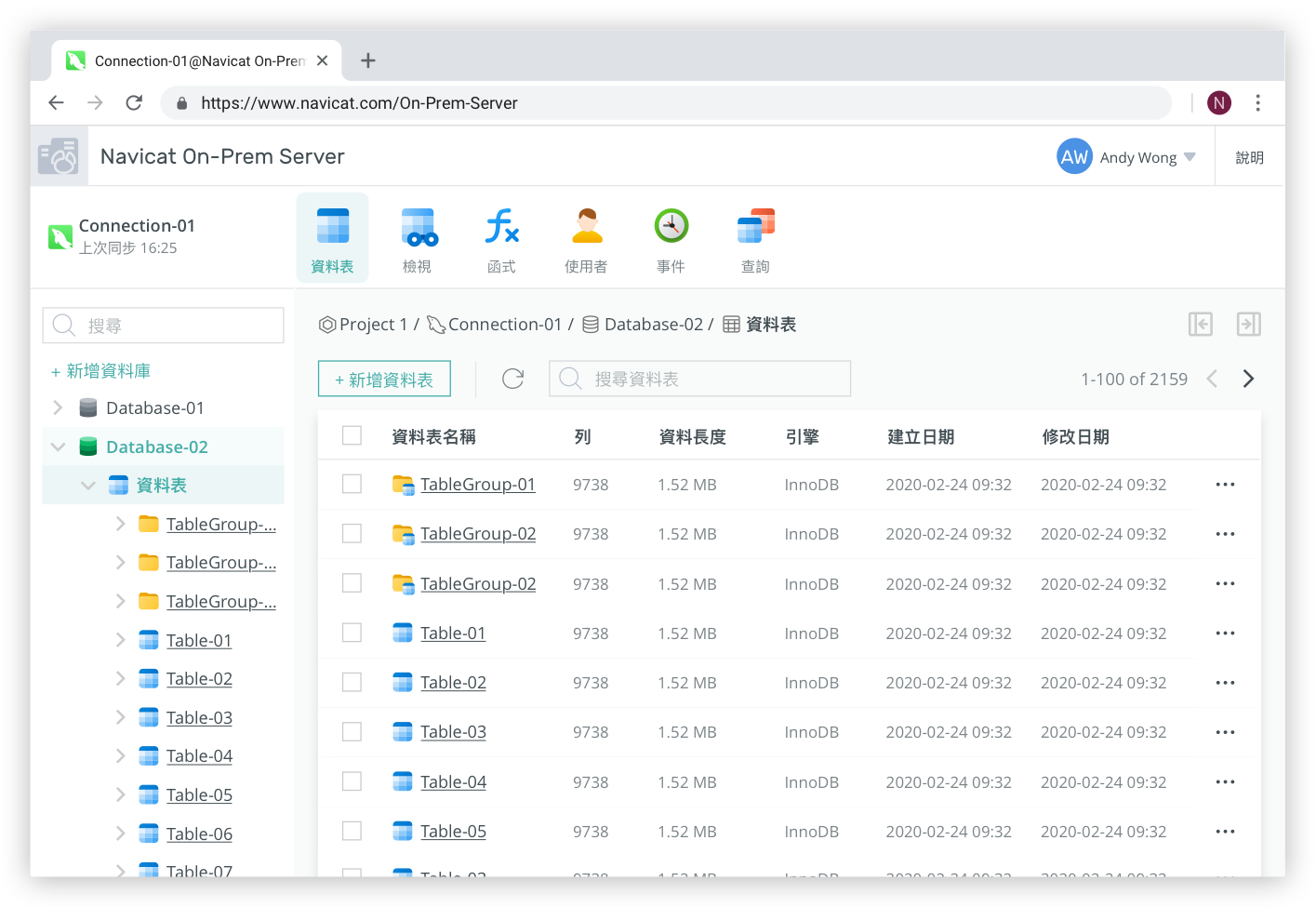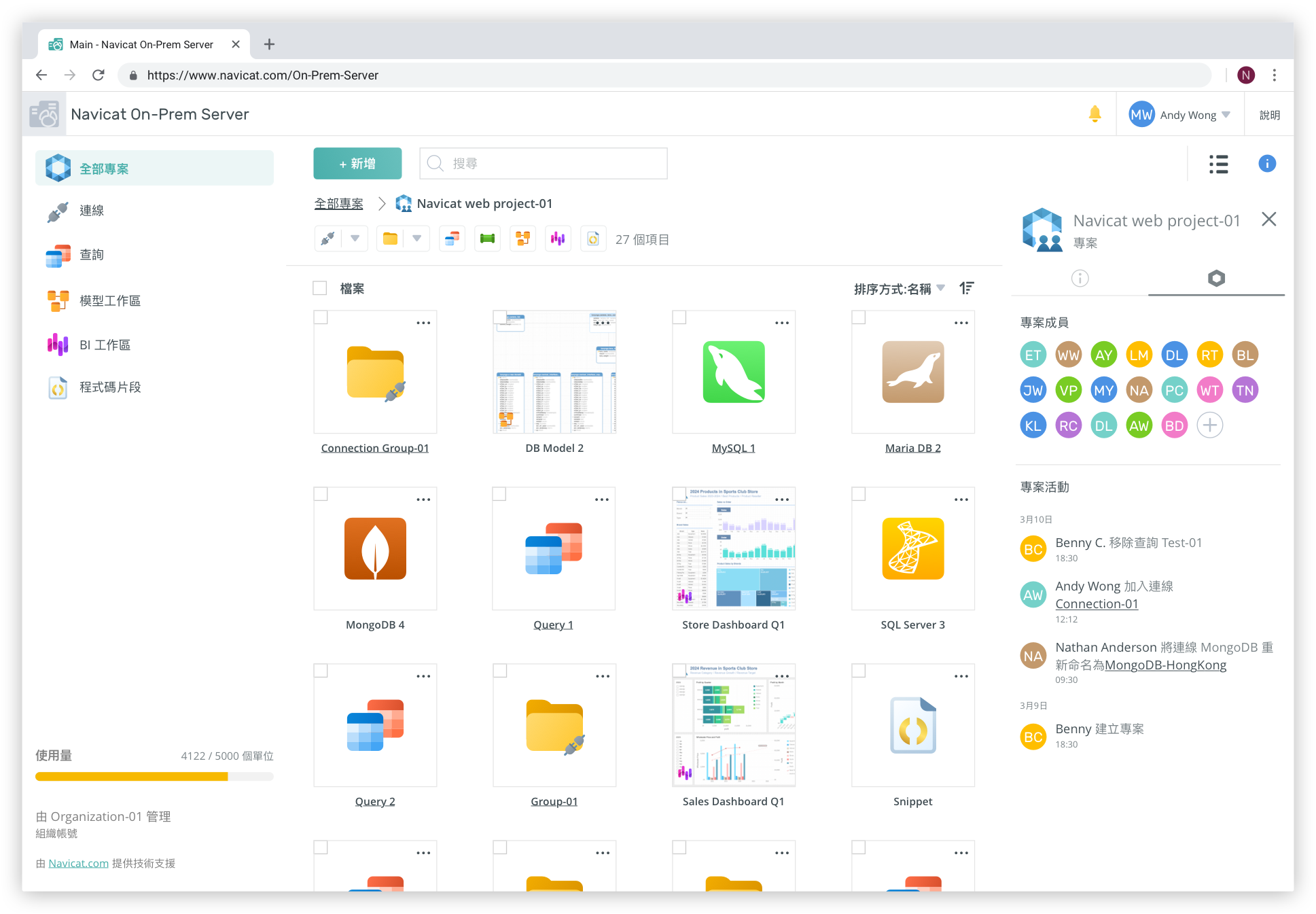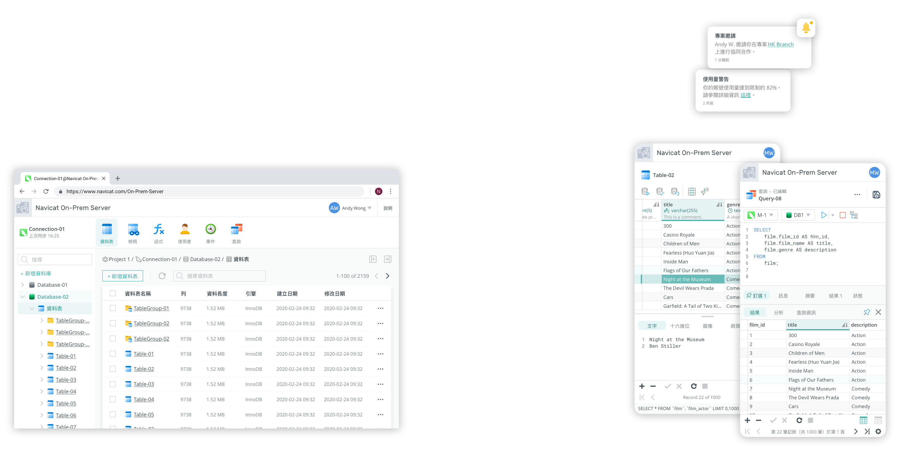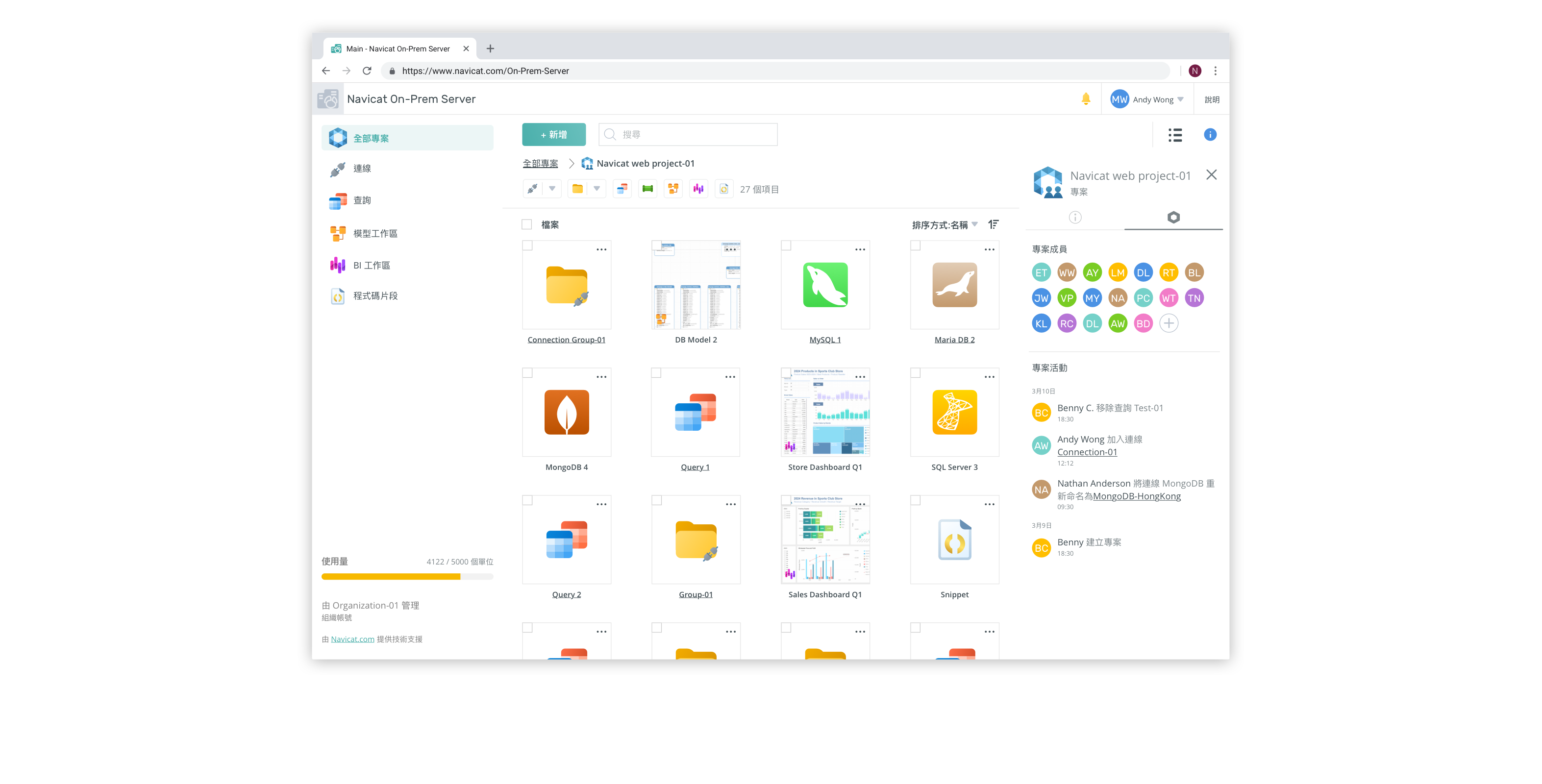 透過 Navicat On-Prem Server,你可以完全控制你的系統並確保百分百資料隱私保護,同時仍享有雲端解決方案所帶來的便利性和功能。除了安全的檔案管理,它還提供強大的資料庫管理功能,可用於管理、監控和維護 MySQL、MariaDB、PostgreSQL 和 Fujitsu Enterprise Postgres(FEP)資料庫。