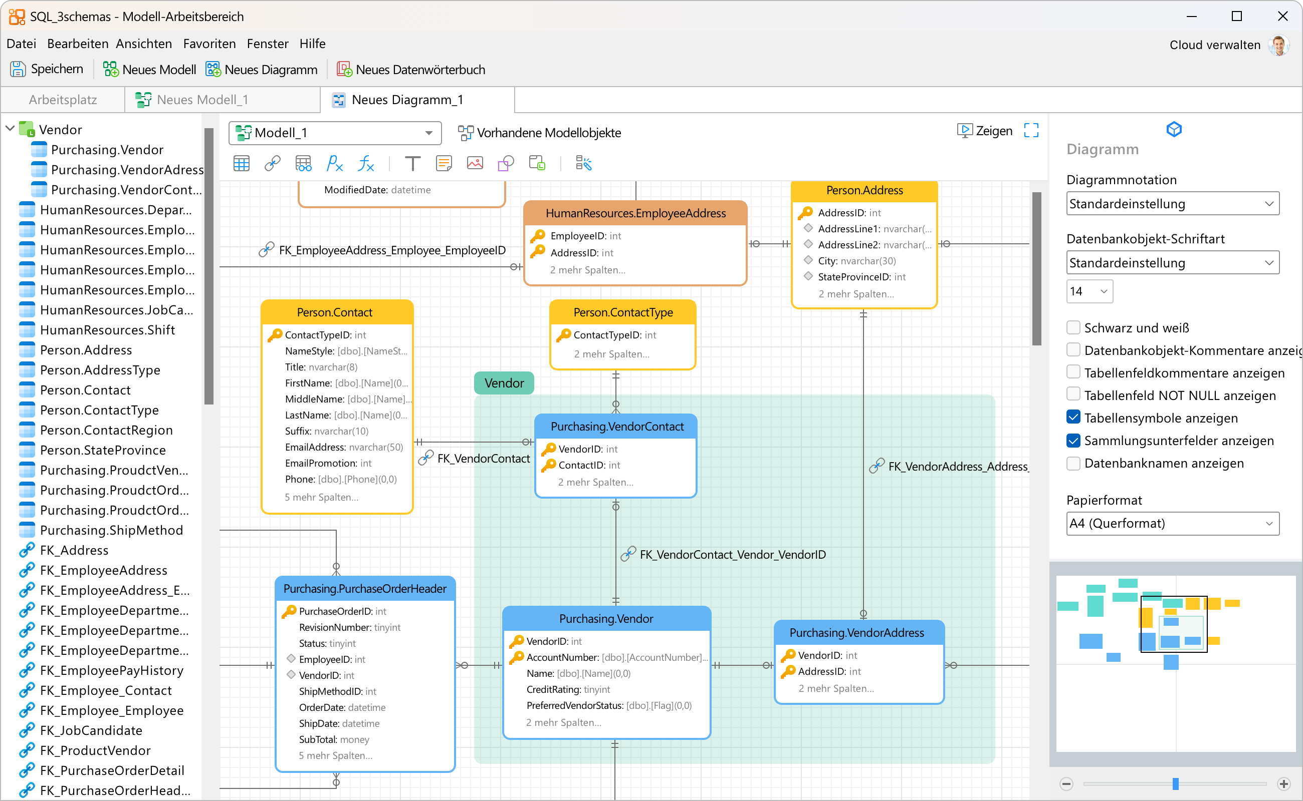 Konvertieren Sie Ihre Datenbanken in grafische Darstellungen, um auf einfache Weise komplexe “Entity Relationship”-Modelle zu erstellen und SQL-Skripts mit einem einzigen Klick zu generieren. Sie können mehrere Modelle in einem einheitlichen Arbeitsbereich erstellen, um verschiedene Objekte in einem Diagramm darzustellen und so die Navigation und das Verständnis komplexer Systeme zu verbessern.
